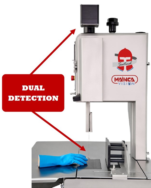 Sentinel je nova generacija tračnih žag, opremljena s patentiranim sistemom MAINCA Vision: edinstvenim sistemom z DVOJNIM ZAZNAVANJEM, ki uporablja eno samo gumijasto rokavico brez povezave s strojem (zgornja kamera zaznava barvo rokavice, spodnji senzor na rezalni mizi pa zazna prste, skrite pod izdelkom, zahvaljujoč ekskluzivni zaznavni rokavici Sentinel).