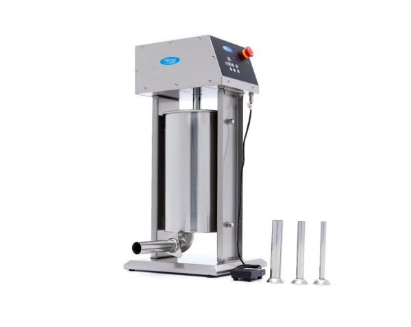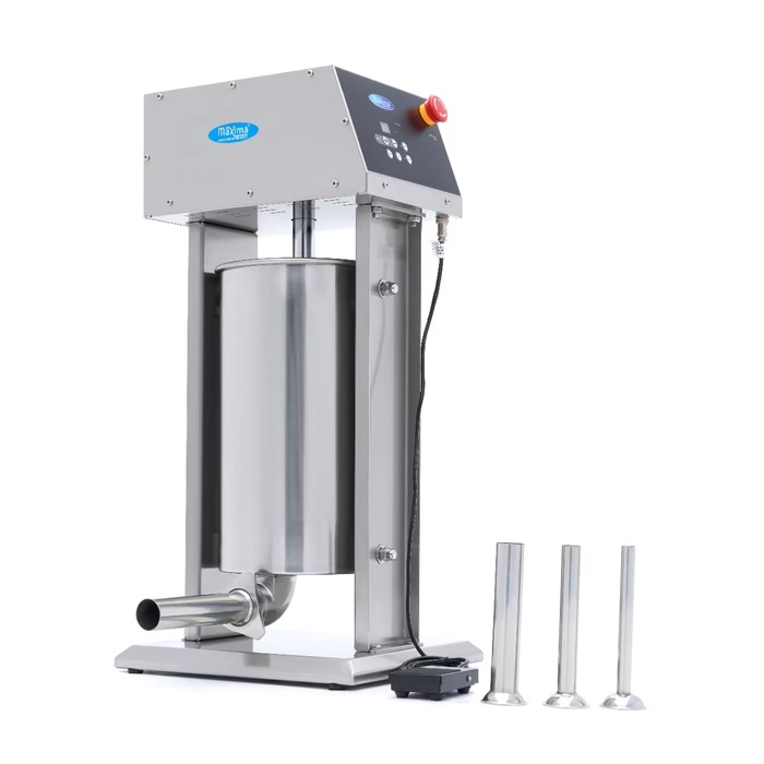 S tem avtomatskim polnilnikom klobas s prostornino 15 l lahko hitro in učinkovito napolnite svoje klobase. Ta profesionalni polnilnik klobas je v celoti izdelan iz nerjavečega jekla in ima štiri polnilne cevi s premerom 16, 22, 32 in 38 mm. Vključuje tudi nožni pedal za upravljanje polnilnika klobas, tako da imate proste roke za polnjenje in obračanje klobas. Pritisna plošča v tej napravi ima silikonsko tesnilo, ki je neprepustno in odstranljivo. Ta profesionalni polnilnik klobas ima 10 hitrosti polnjenja od 0 do 100, tako da imate vedno pravo hitrost, ki jo potrebujete za natančno doziranje.