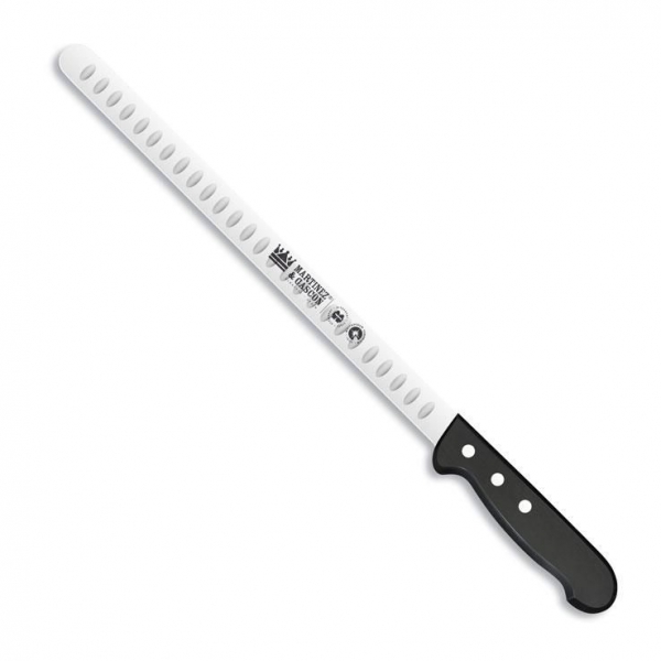 Cena z DDV:Nož za rezanje pršuta z vdolbenim rezilom, 30 cm, črn ročaj iz umetne mase.